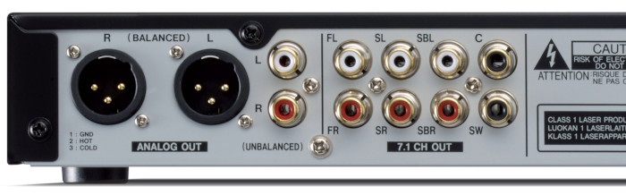 Linke Rückseite: Hier befinden sich Stereo-XLR-Buchsen sowie ein unsymmetrisches Chinch-Pärchen. Daneben gibt der Player analogen 7.1-Ton via Cinch dank der integrierten Mehrkanal-Decoder aus.