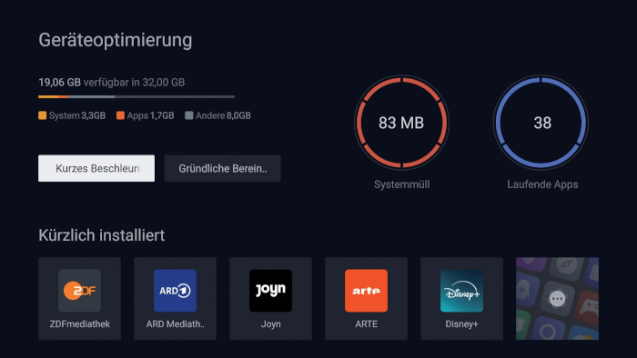 Über die Taste „TCL Home“ auf der Fernbedienung gelangt man zum „Safety Guard“. Hier kann man unter den Menüpunkten „Genehmigungsschild“, „App Manager“, „Ausrüstungsmanager“ und „Vereinbarungen und Lizenz“ den Sicherheitsschutz sowie die Leistungsfähigkeit erhöhen. Über das „Genehmigungsschild“ erlaubt man unter anderem, welche Programme automatisch auf dem Startbildschirm aufgeführt werden dürfen. Der „App Manager“ ermöglicht die Deinstallation von Anwendungen. Zu viele Apps können den internen Speicherplatz verknappen und den Fernseher langsamer machen. Im „Ausrüstungsmanager“ erhält man einen Überblick über die Speicherverwaltung. Hier kann man unnötigen Ballast entfernen und den Flat-TV beschleunigen.