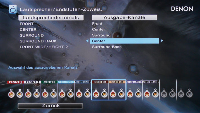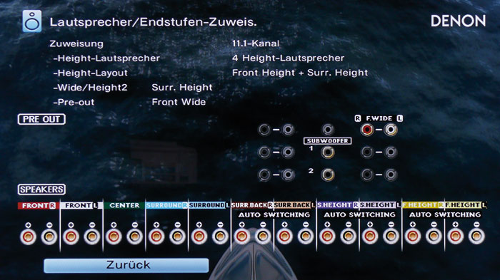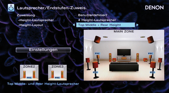 Der Denon ist ab Werk mit Dolby Atmos ausgerüstet und lässt sich für 149 Euro mit Auro 3D ausrüsten. Weil Atmos viele Boxenkonfigurationen erlaubt, Auro 3D aber nicht, wird die Sache kompliziert: Will man beide Formate nutzen, ist man bei Dolby auf zwei statt vier Höhenlautsprecher beschränkt. Die folgenden Bilder zeigen die vielfältigen Einstellmöglichkeiten hinsichtlich der Lautsprecher-Kanäle.