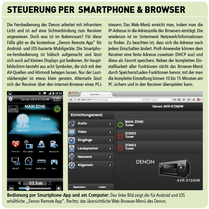 In Sachen Handhabung hat Denon viel richtig gemacht: Die luxuriöse Fernbedienung mit Display ist lernfähig und mit großen, beleuchteten Tasten bestückt. Das Menü wartet mit Komfort-Extras wie der für alle Boxen gemeinsamen oder separaten Equalizer-Einstellung auf. Zu kritisieren ist lediglich die Anleitung, weil die nur als CD beiliegt. Außerdem könnten die Endstufen-Einstellungen etwas übersichtlicher sein.