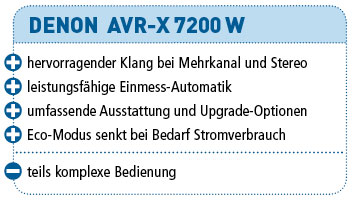 Optisch tritt Denons in Schwarz und Silber erhältliches Receiver-Flaggschiff eher zurückhaltend auf: Eine große Klappe lässt seine Front aufgeräumt wirken. Erwartungsgemäß macht auch die Verarbeitung einen hochwertigen Eindruck – nur die scharfkantigen oberen Gehäuseecken gefielen uns an unserem Test-Exemplar nicht so gut. Die Anschluss-Highlights sind drei HDMI-Ausgänge, ein analoger 7.1-Eingang, ein Phono-MM-Eingang sowie eine 19 Buchsen umfassende Vorverstärker-Sektion. Bereits der 800 Euro günstigere AVR-X 5200 W (Test in Ausgabe 11-2014) punktet durch neun Endstufen, 13 gleichzeitig nutzbare Vorverstärkerkanäle (genauer gesagt 11.2) sowie Audysseys beste Einmess-Automatik. Das Topmodell hat zwar nicht mehr Endstufen unter der Haube, sichert sich aber mit Verfeinerungen einen Vorsprung: So sollen die eigens für Denon gefertigten DHCT-Leistungstransistoren im 7200er bis 20 Watt zusätzliche Power je Kanal liefern, während für mehr Klangpräzision eine Signalverarbeitung mit 32 statt 24 Bit (D.D.S.C.-HD32) sowie symmetrisch angeordnete Monoblock-Endstufen sorgen.