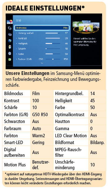 In finsteren Filmszenen à la „Gravity“ spielt die Smart-LED-Schaltung ihre Stärken aus: Sie senkt beziehungsweise erhöht zonenabhängig die Intensität des (Edge-LED-)Backlights und verbessert so den Kontrast. Leider kann man den Overscan im Tuner-Betrieb seit dem letzten Firmware-Update nicht mehr dauerhaft abschalten. Am Schärfeeindruck gibt es fast nichts auszusetzen; nur SDTV-Sender zeigen vereinzelt Flimmereffekte. Die Bewegungsdarstellung kann durch benutzerdefinierte „Motion Plus“-Einstellungen mit eingeschalteter „LED Clear Motion“ nahezu perfektioniert werden.