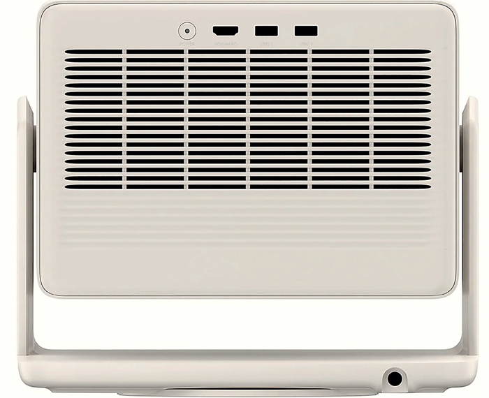 Besagte Flexibilität hat der Horizon S Max seinem integrierten Ständer zu verdanken, auf dem das Gerät um 360 Grad gedreht werden kann. Überdies kann der 2.000 Euro teure Beamer zur Zimmerdecke gekippt werden, falls dort eine Projektion erwünscht ist. Mit einer Stellfläche von 39,3 x 31 Zentimeter ist der Platzbedarf relativ klein, und sein geringes Gewicht von 4,8 Kilogramm macht ihn für den mobilen Einsatz attraktiv. Das Objektiv wird zuverlässig vor Staub geschützt, indem beim Ausschalten eine mit Stoff bezogene Schiebeklappe davor fährt. Die Leistungsaufnahme beträgt sparsame 136 Watt.