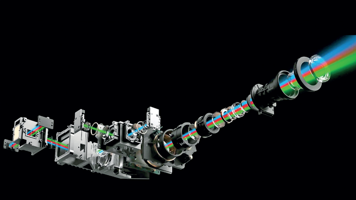 Laser und LEDs werden im Projektor kombiniert, um die Primärfarben Rot, Grün und Blau auszugeben.