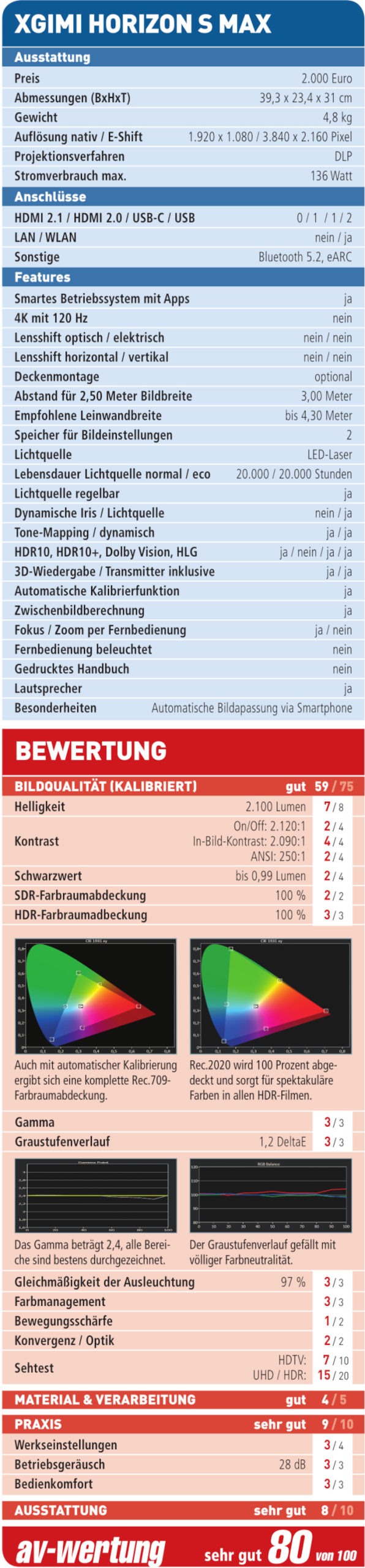 Die nominelle Maximalhelligkeit von 3.100 Lumen übertrifft der Proband mit gut 13 Prozent im Bildmodus „Hohe Helligkeit“. Allerdings ist das Bild zu grün und das Betriebsgeräusch mit 48 Dezibel viel zu laut. Im „Benutzer“-Modus ist der Horizon S Max mit 28 Dezibel angenehm leise und erreicht kalibriert 2.100 Lumen bei HDR bzw. 1.800 Lumen bei SDR. Der Kontrast beträgt 2.120:1 (On/Off), 2.090:1 (Inbild) und 250:1 (ANSI), was sich in dieser Preisklasse sehen lassen kann. Die Farbräume Rec.709 und Rec.2020 werden zu 100 Prozent abgedeckt. Erstrebenswert ist ein besserer Schwarzwert, der mit 0,99 Lumen eher dunkelgrau ausfällt. Lobenswert ist dafür die gleichmäßige Ausleuchtung mit durchschnittlich 97 Prozent.