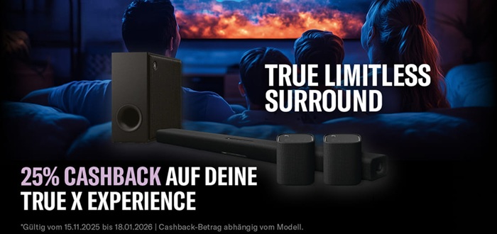Weihnachten steht vor der Tür, bei Yamaha gibt es jetzt schon Geschenke: Beim Kauf einer Yamaha Soundbar TRUE X BAR 50A, wahlweise zusammen mit zwei Lautsprechern True X SPEAKER 1A, oder des Komplettpakets True X SURROUND 50A gibt es 25% des Kaufpreises als Cashback zurück. Das gilt für jeden Kauf bei einem autorisierten Yamaha Händler bis zum 18. Januar 2026.